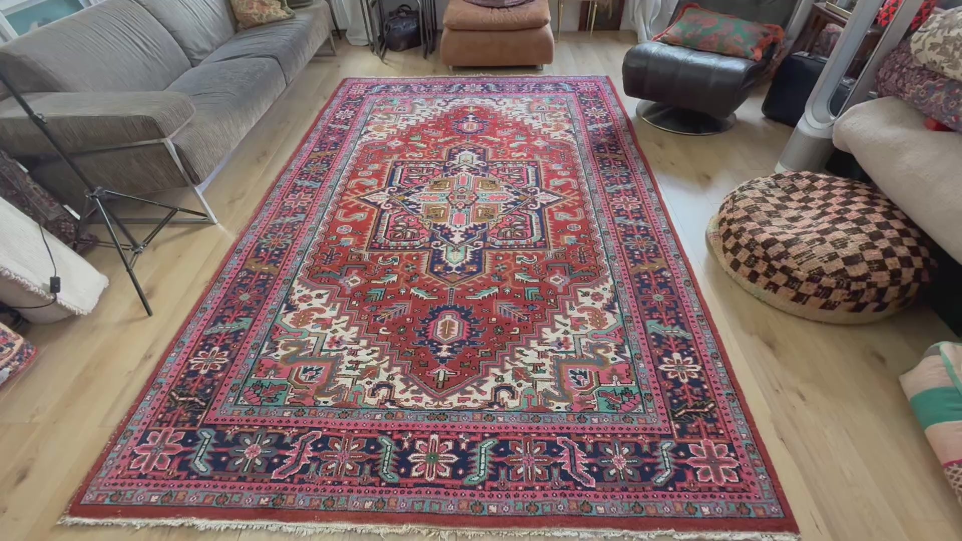 Een prachtig groot tapijt met een klassiek medaillon in rijke tinten roestrood, blauw en roze.