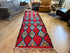 Deze lange vintage loper is handgemaakt in Marokko en valt direct op door zijn diepe rode basis en het ritmische ruitpatroon dat zich over de volledige lengte uitstrekt. De kleuren – variërend van turkoois en groen tot zacht roze en accenten van geel en zwart – geven het kleed een levendige, warme uitstraling zonder schreeuwerig te worden.