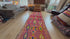 Deze lange vintage loper is een krachtig voorbeeld van de vrije, expressieve tapijttradities uit Marokko. Het warme fuchsia-roze veld vormt het decor voor speelse diamantmotieven in diepblauw, mosterdgeel en frisse groentinten — een combinatie die doet denken aan de creatieve energie van de jaren ’70.